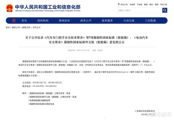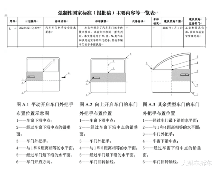 核心要求很简单:每个车门应配备机械释放车门外把手;每个车门应配备至少一个机械释放车门内把手;车门内把手应配备符合要求的永久性标志;车门内把手附近应增加能表明开启方式的中文或图示说明;车辆产品使用说明书应包括车门把手的使用说明;对车门把手进行试验,试验过程中车门把手不应断裂或脱落,试验后车门把手应能开启车门。《汽车车门把手安全技术要求》建议实施日期为2027年1月1日。